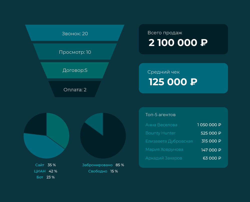 Мультиворонка обеспечивает 100% видимость всех лидов и их статусов, позволяя отслеживать каждую сделку от лида до оплаты. Настройте этапы под ваш бизнес-процесс для ведения сделок по аренде, продаже, новостройкам и другим направлениям.