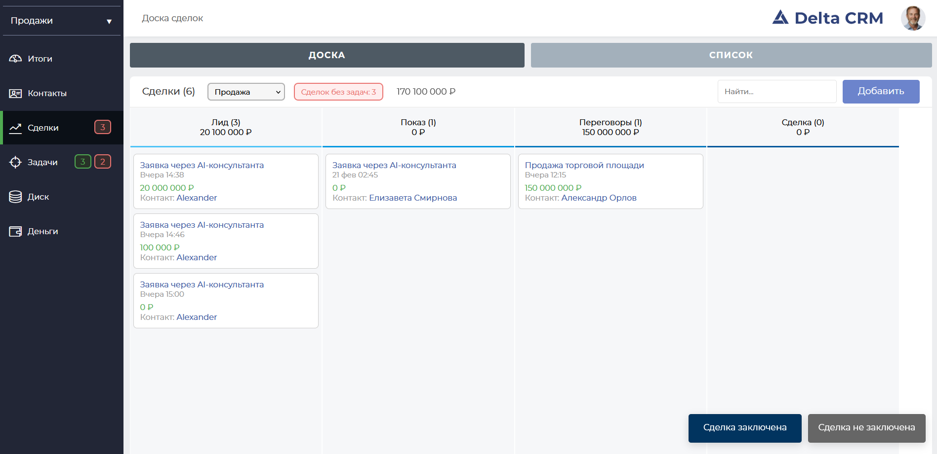 Доска сделок, индикаторы задач и напоминания дают полный контроль — ни одного упущенного лида. Руководитель управляет продажами одной командой из мессенджера, а команда видит чёткий список дел на день.