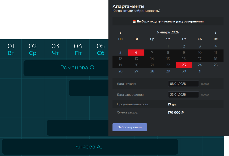 Клиенты получают доступ к актуальной загрузке объектов и самостоятельно бронируют удобные даты в личном кабинете. Шахматка бронирования визуализирует заказы аренды, а интерактивная схема позволяет одним взглядом получить информацию о состоянии объектов.